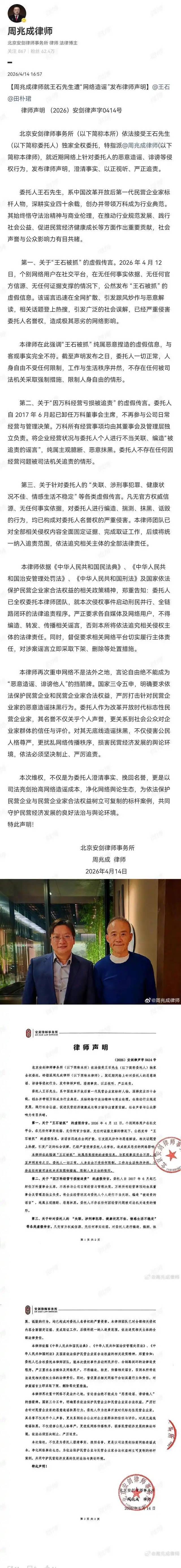 【周兆成律师就王石先生遭“网络造谣”发布律师声明】